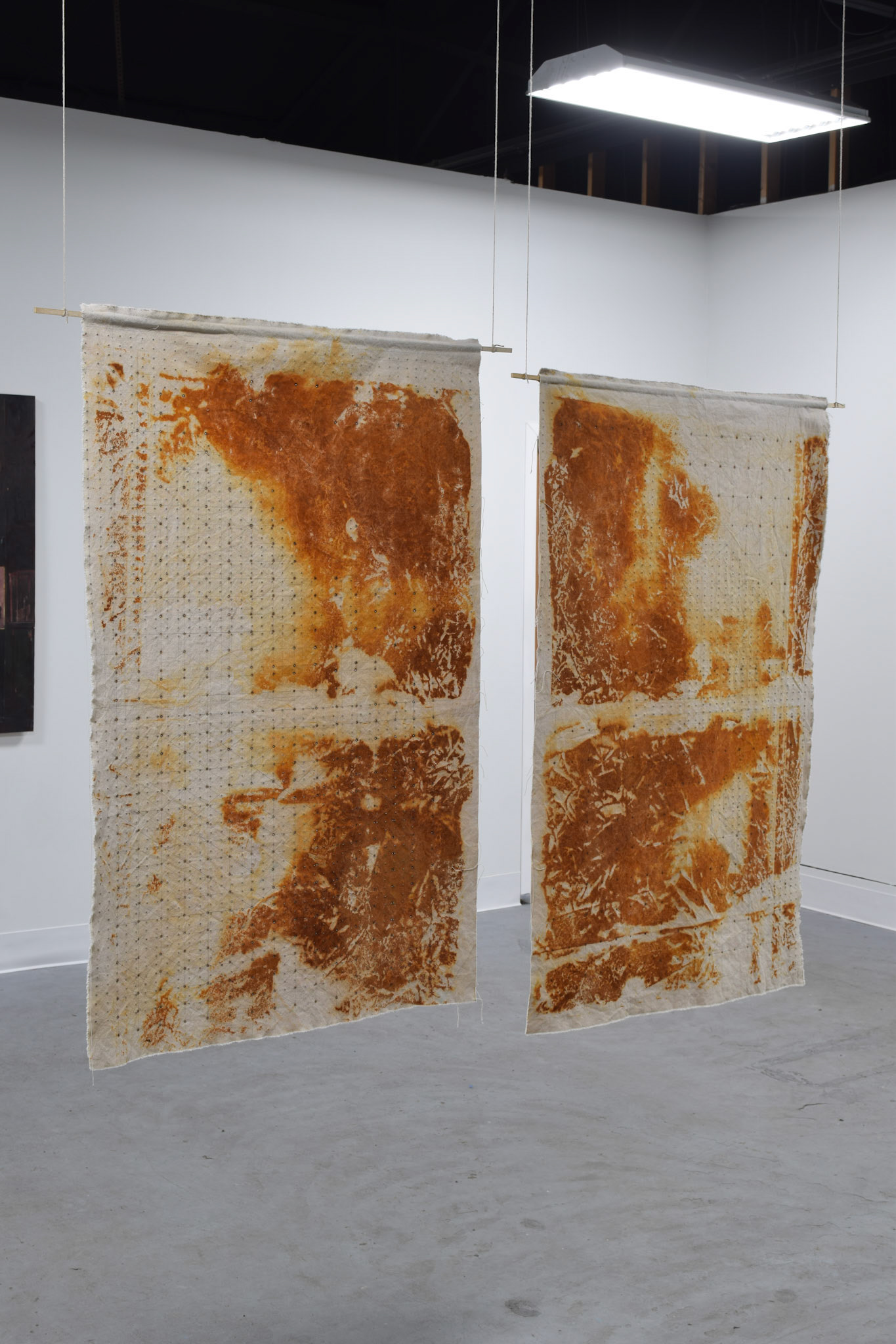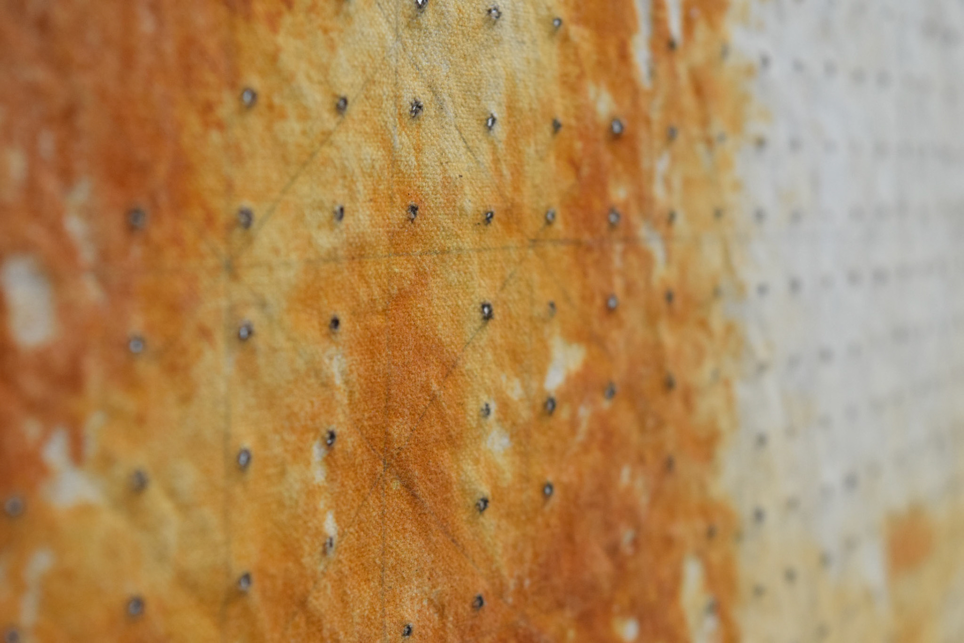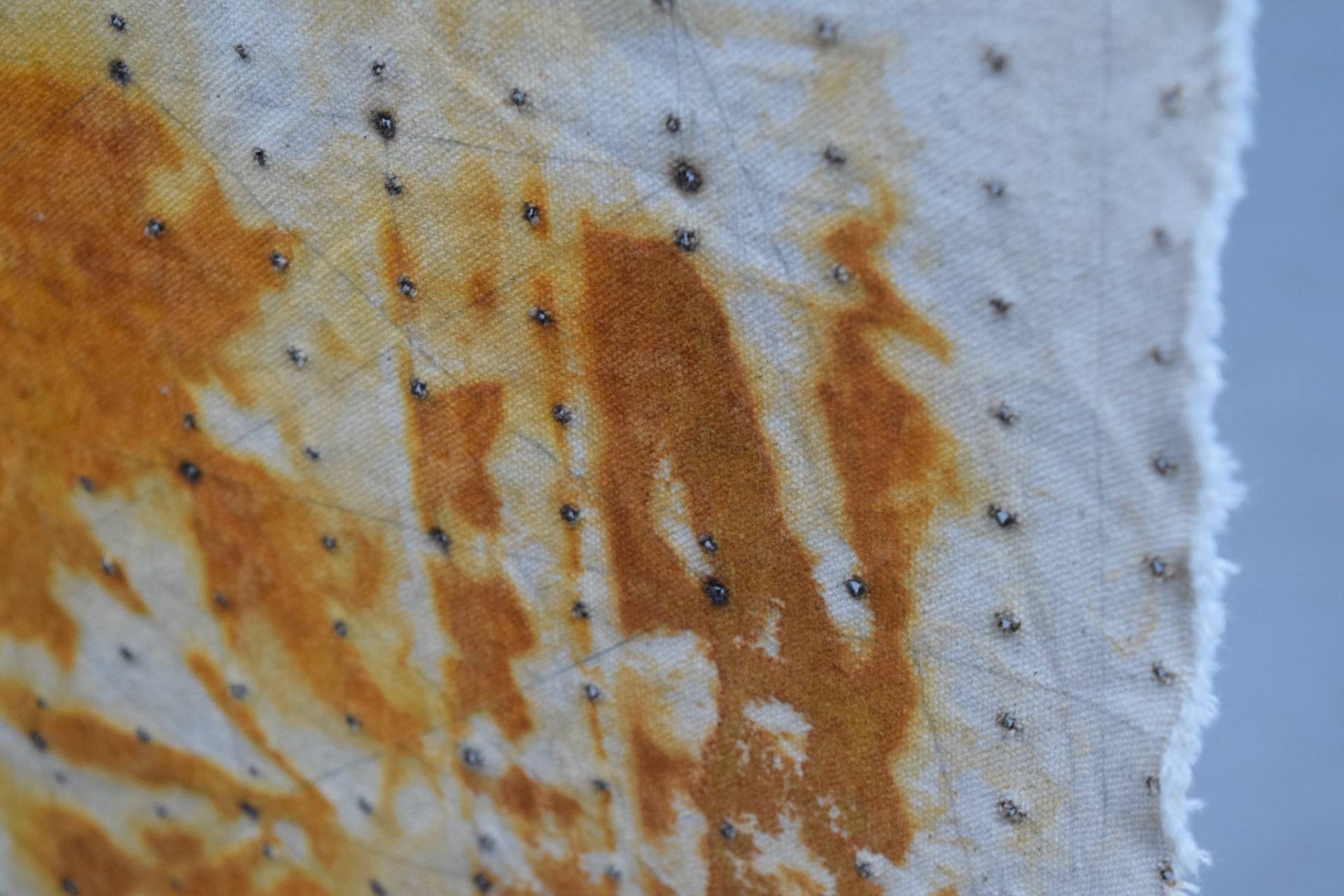 Rust transferred from a large swath of weathered sheet metal onto vinegar-soaked canvas, left outside under tarp for two days in October. Holes made using soldering iron as an attempt to organize the image.