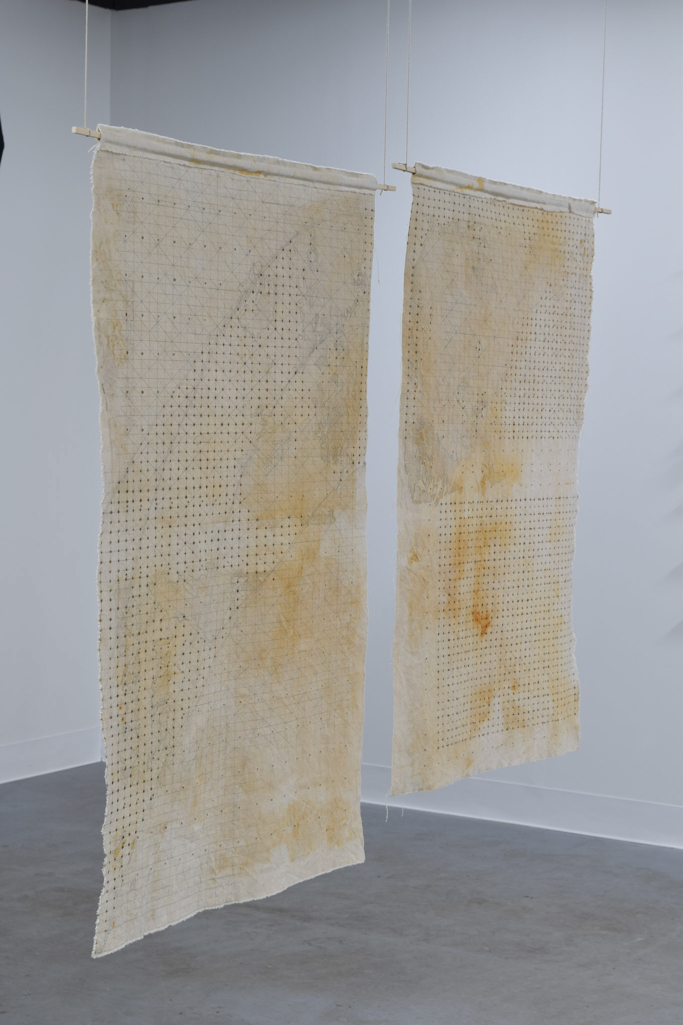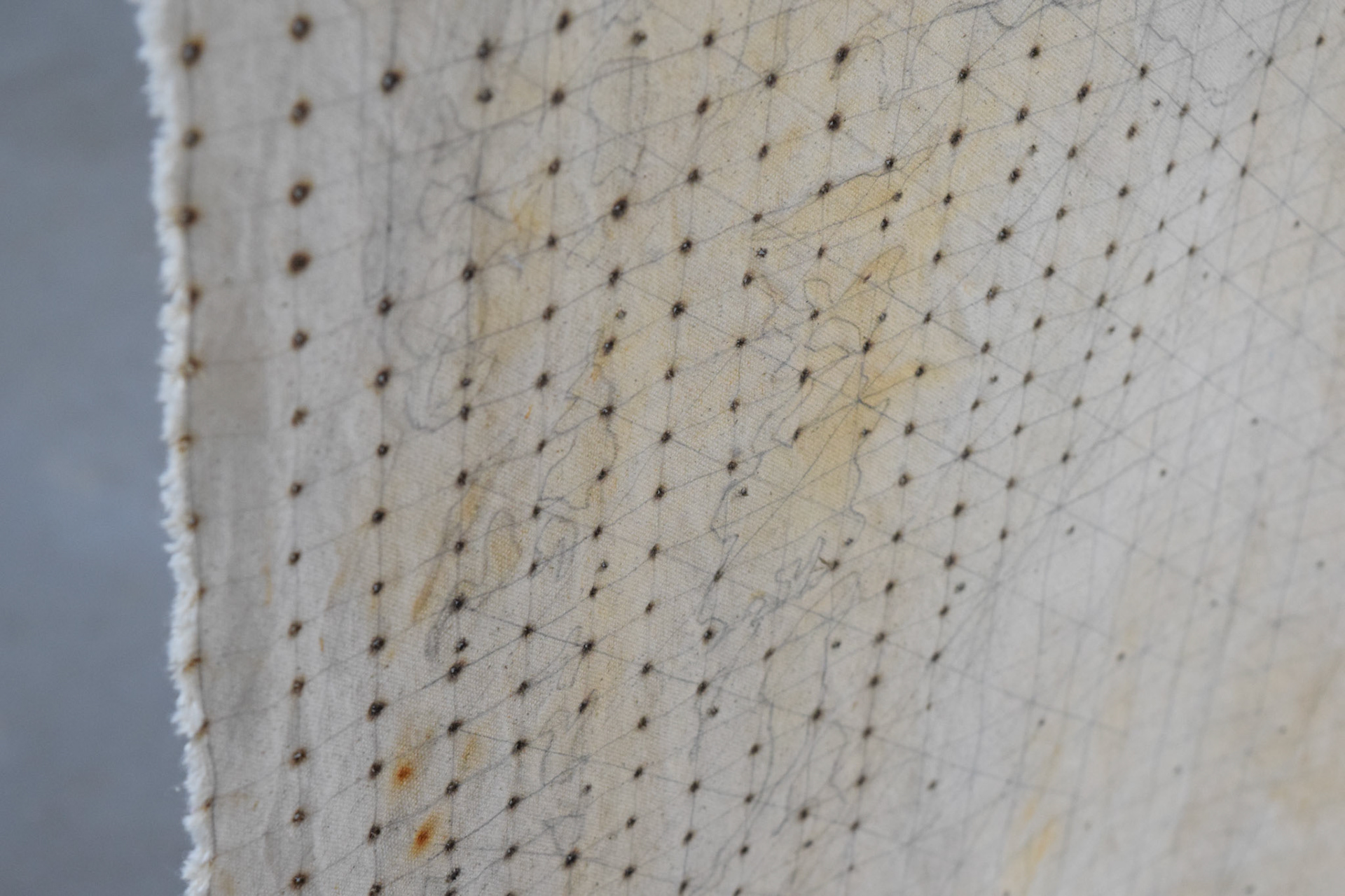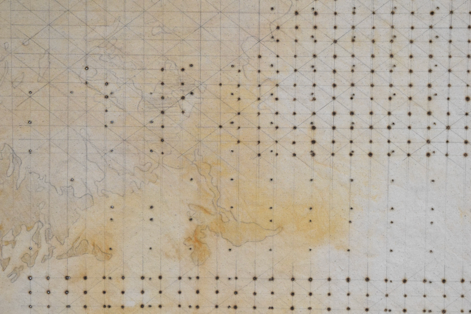 Rust transferred from a large swath of weathered sheet metal onto vinegar-soaked canvas, left outside under tarp for two days in October. Holes made using soldering iron as an attempt to organize the image.